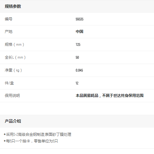 產(chǎn)品名字:世達(dá)5件6.3mm系列50mm旋具頭T25
